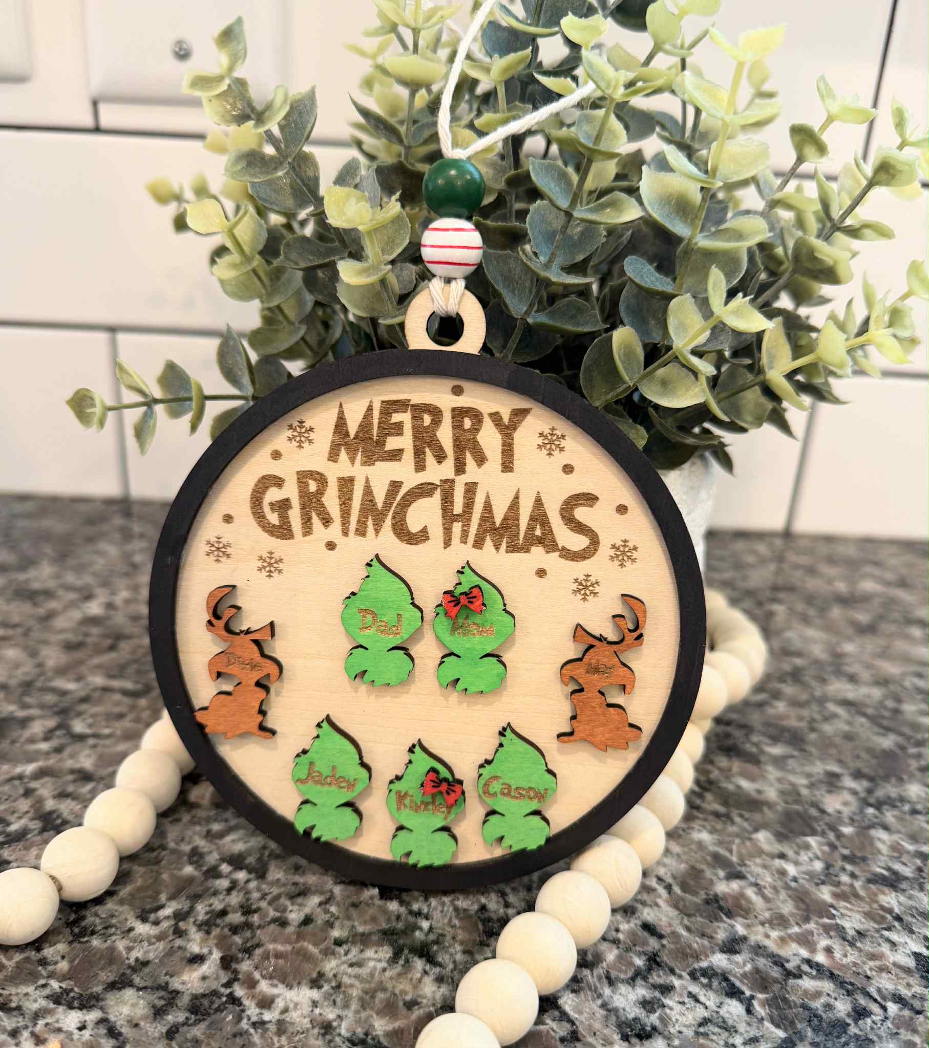 Bring a little Whoville magic to your tree this year with our Custom Grinch Family Ornament! Each ornament is handcrafted from wood and features your family members as cute Grinch shaped characters, complete with their names.
